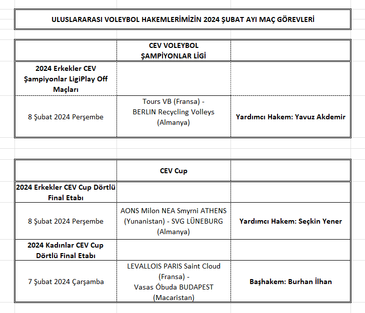 Avrupa Voleybol Konfederasyonu (CEV), 2024 Avrupa Kupalarında 3 Uluslararası Voleybol Hakemimize Şubat ayının ilk yarısında CEV Şampiyonlar Ligi ve CEV Cup’ta oynanacak karşılaşmalarda görev verdi.
