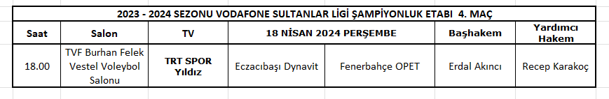 Vodafone Sultanlar Ligi Play Off final etabı 3. maçı 18 Nisan 2024 Perşembe günü oynanacak.