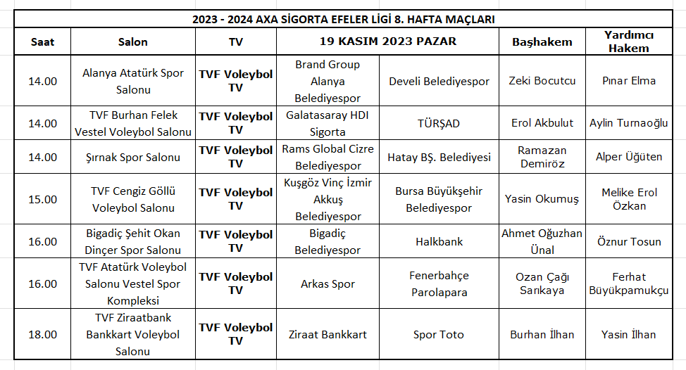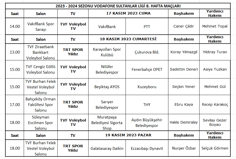 Vodafone Sultanlar Ligi’nde 2023-2024 Sezonu 8.hafta maçları 17-19 Kasım 2023, AXA Sigorta Efeler Ligi 8.hafta maçları ise 19 Kasım 2023 tarihlerinde oynanacak.