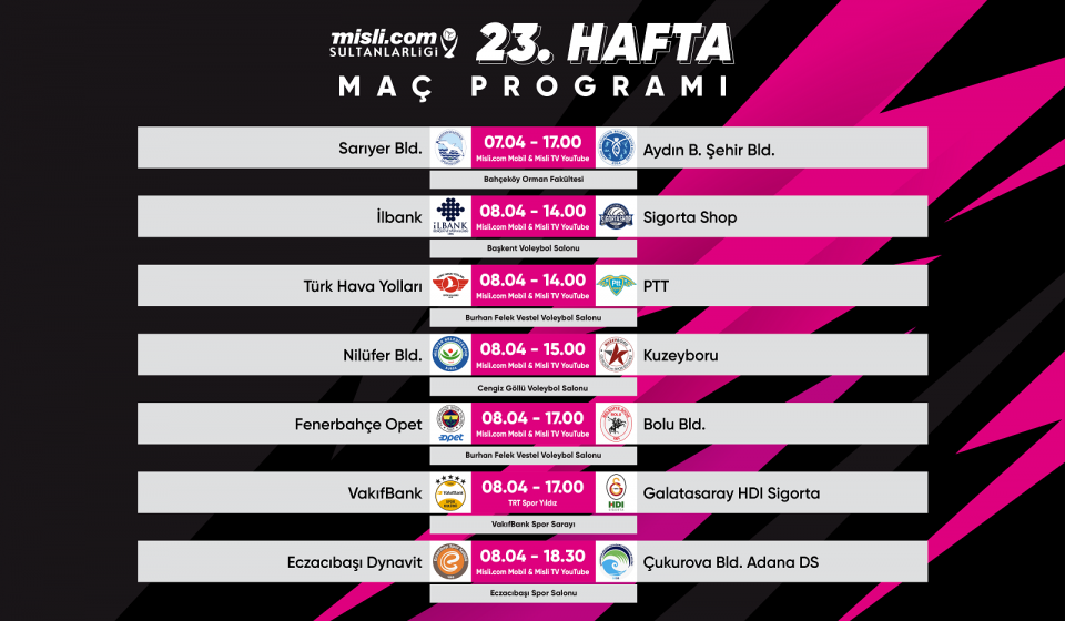 | 8 Nisan Cumartesi | 17.00 | Fenerbahçe Opet-Bolu Bld. | Misli.com Mobil ve Misli TV YouTube | TVF Burhan Felek Vestel |