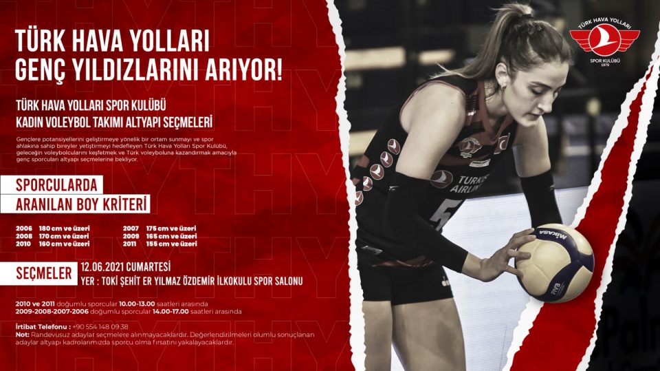 Türk Hava Yolları Spor Kulübü Kadın Voleybol Takımı altyapı seçmeleri 12 Haziran 2021 Cumartesi günü TOKİ Şehit Er Yılmaz Özdemir İlkokulu Spor Salonu’nda gerçekleşecektir.